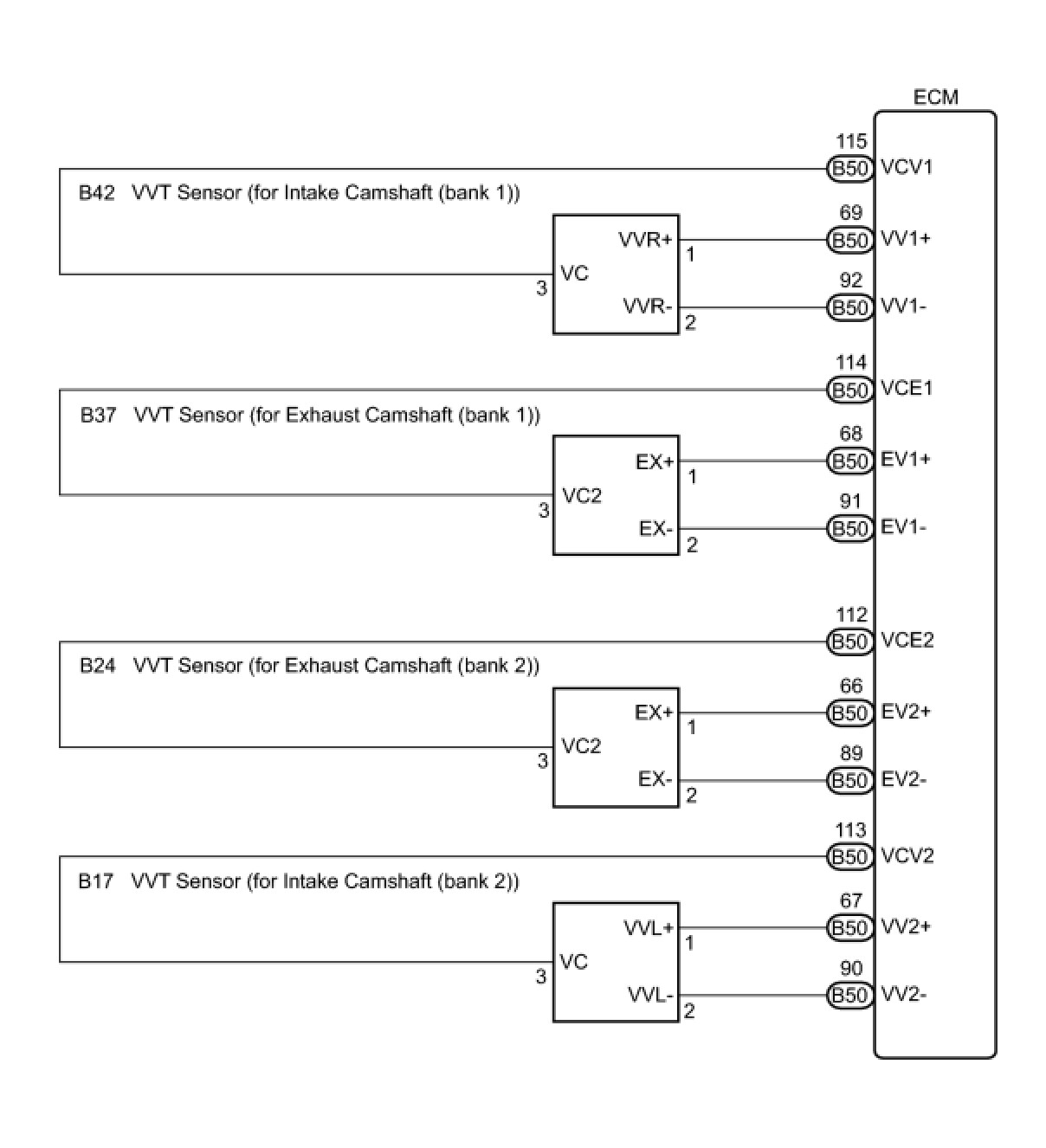 The ECM constantly uses 5 V from the battery voltages supplied to the +B (BATT) terminal to operate the microprocessor. The ECM also provides this power to the sensors through the VC output circuit.