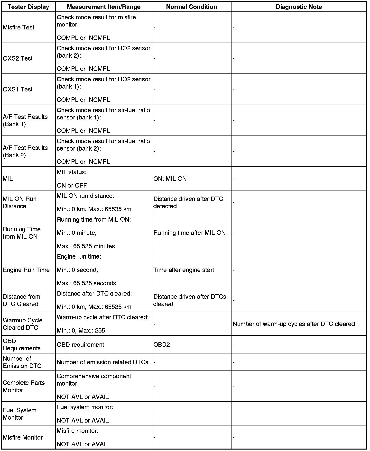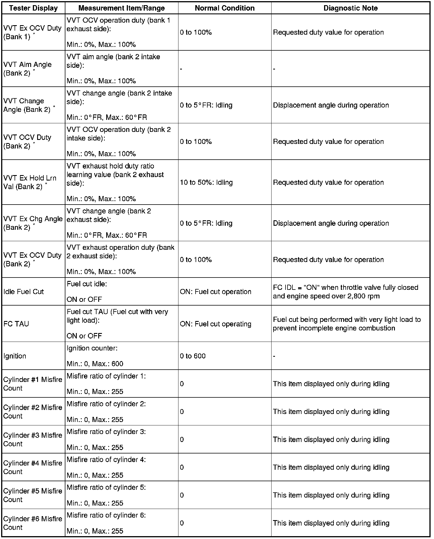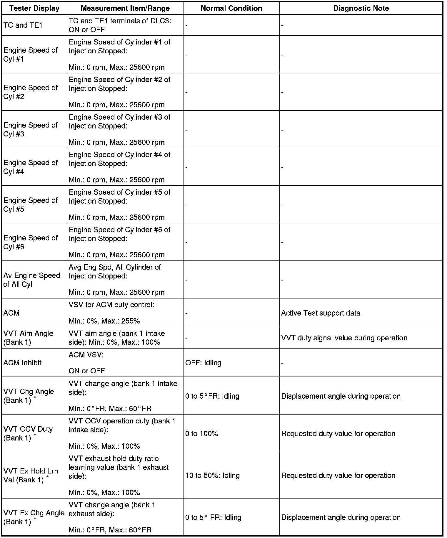 - *: Data List values are displayed only when performing the following Active Tests: Control the VVT Linear (Bank1), Control the VVT Linear (Bank2), Control the VVT Exhaust Linear (Bank1) and Control the VVT Exhaust Linear (Bank2). For other Active Tests, the Data List value will be 0.