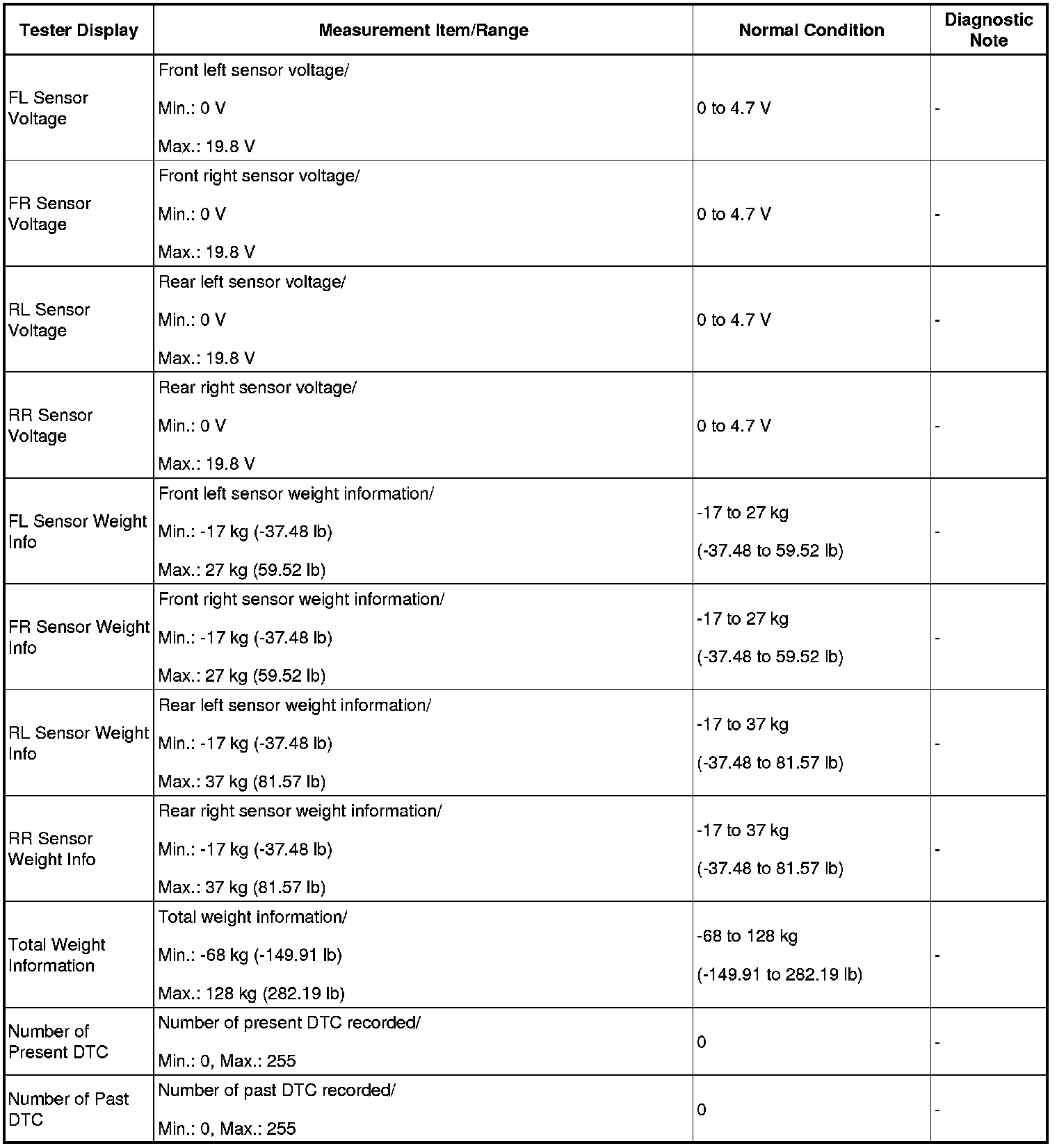1. DATA LIST FOR OCCUPANT CLASSIFICATION ECU