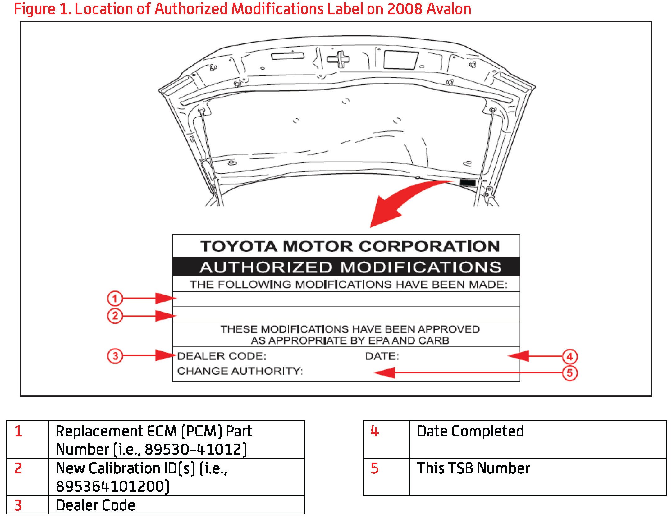 1. Check for the Authorized Modifications Label affixed to the vehicle in the location shown in Figure 1. Confirm if the TCM calibration has been updated. If the calibration ID listed is NOT the latest TCM calibration - go to step 2.