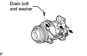 (a) When replacing the cooler compressor assembly with a new one, gradually discharge the inert gas (helium) from the service valve, and drain the following amount of oil from the vents indicated by the arrows in the illustration before installation.