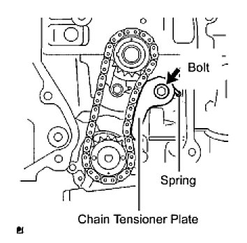 - Insert the damper spring into the adjusting hole, and then install the chain tensioner plate with the bolt.