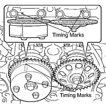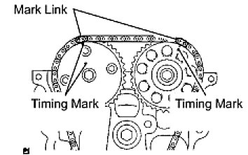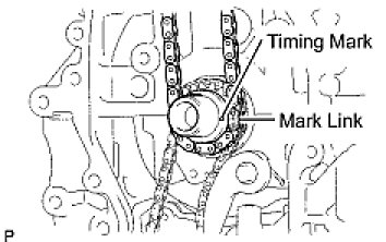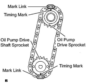 - Install the chain onto the crankshaft timing sprocket with the gold or pink mark link aligned with the timing mark on the crankshaft.