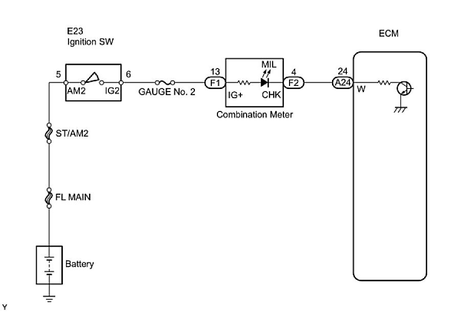 The MIL (Malfunction Indicator Lamp) is used to indicate vehicle malfunction detected by the ECM. When the ignition switch is turned ON position, power is supplied to the MIL circuit, and the ECM provides the circuit ground which illuminates the MIL.