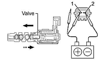 (1) Connect the positive (+) lead from the battery to terminal 1 and the negative (-) lead to terminal 2, and check the movement of the valve.