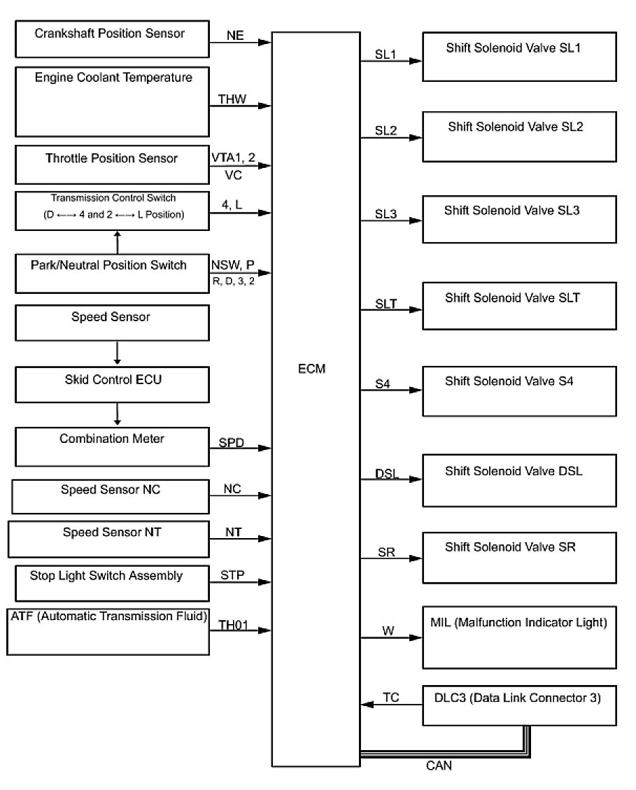 (a) The ECT (Electronic controlled automatic transmission/transaxle) is an automatic transmission/transaxle that electronically controls shift timing using the ECM. The ECM detects electrical signals that indicate engine and driving conditions, and controls the shift point, based on driver habits and road conditions. As a result, fuel efficiency and power transmission performance are improved.
