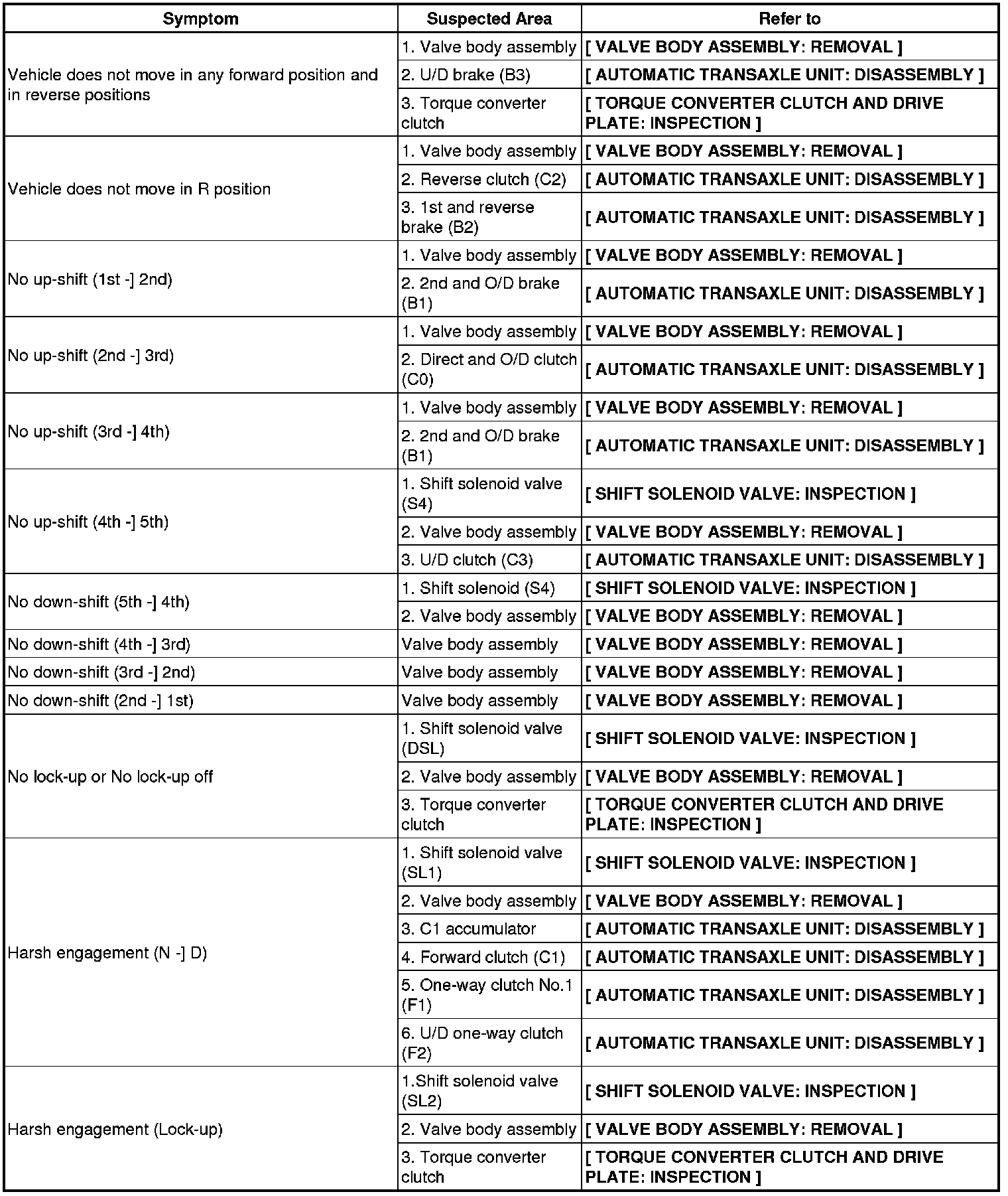 Refer to the table below when the trouble cause is considered to be electrical the instruction "Proceed to next circuit inspection shown on matrix chart" is given in the flow chart of each circuit, inspect the suspected areas in descending order for each symptom. If the trouble still occurs even though there are no abnormalities in any of the other circuits, check and replace the ECM.