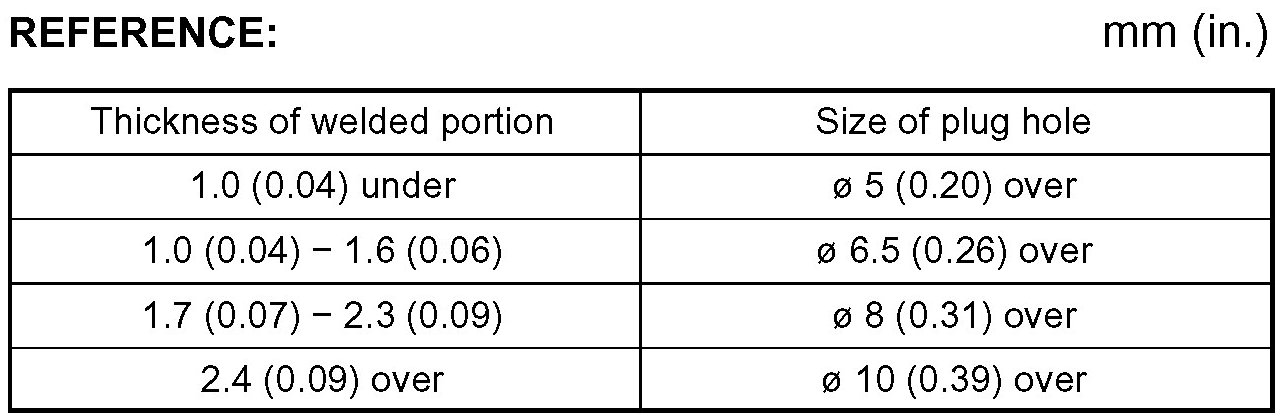 1. When welding panels with a combined thickness of over 3 mm (0.12 in.), use a MIG (Metal Inert Gas) welder for plug welding.