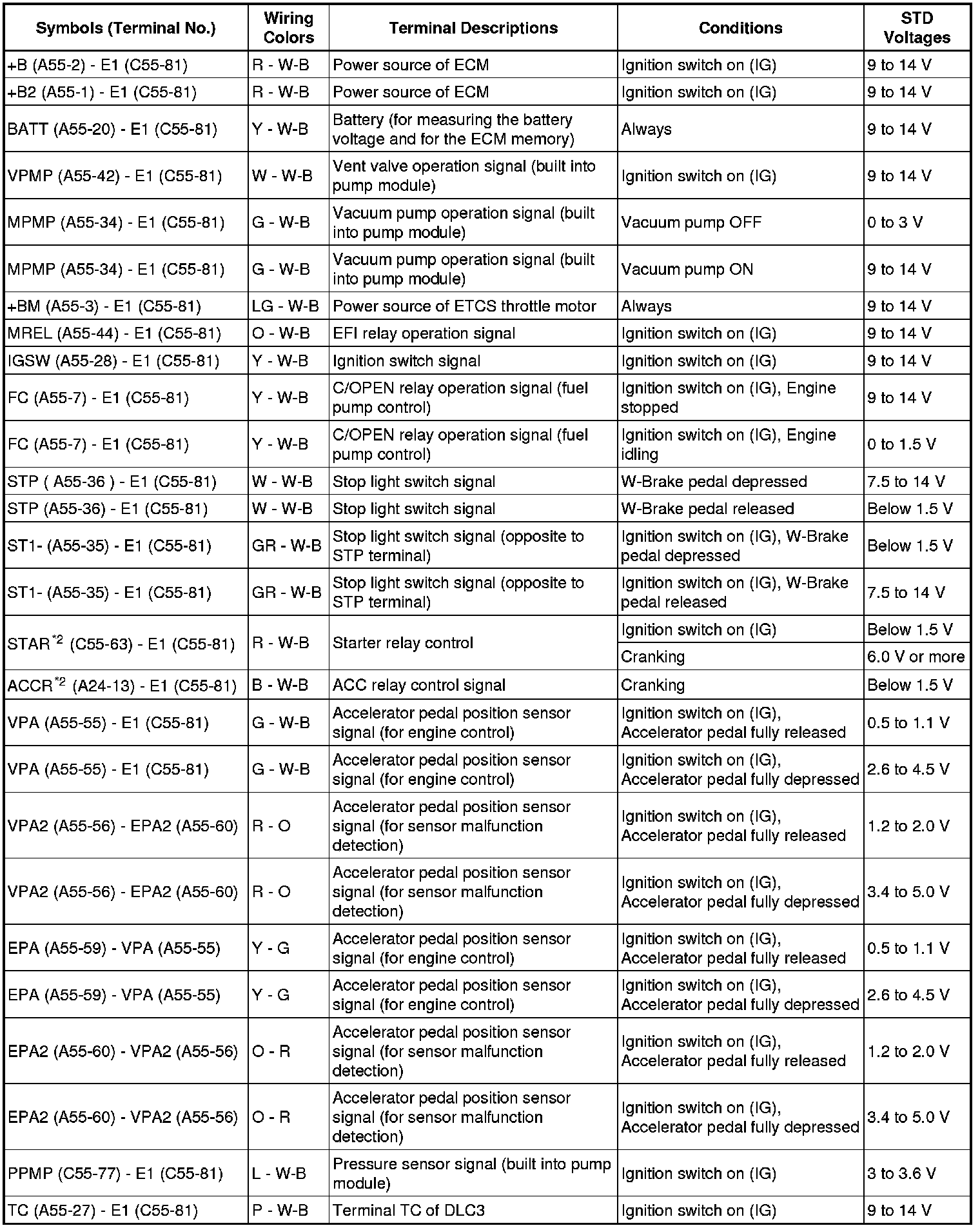 The check results should be compared with the standard normal voltage for that pair of terminals, listed in the "STD Voltages" column.