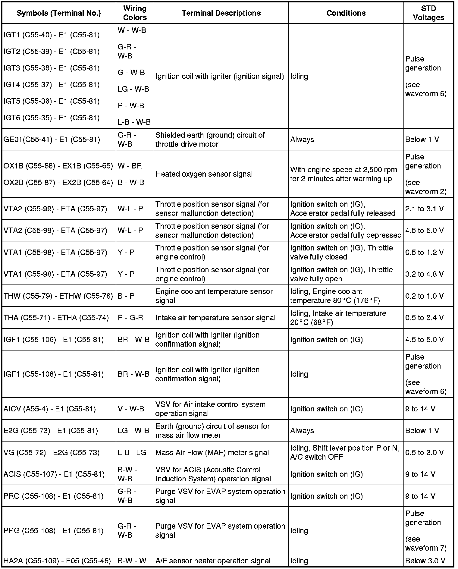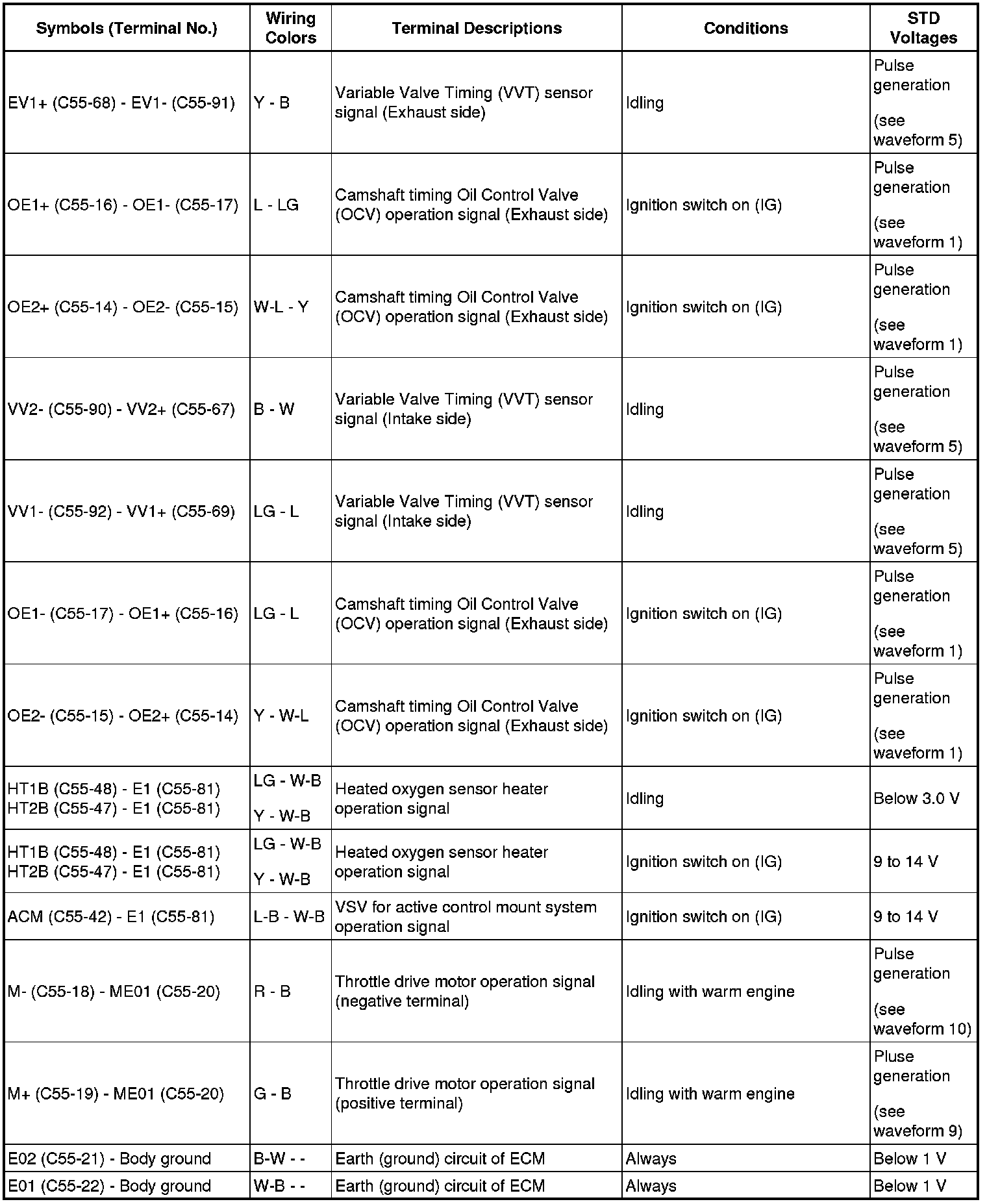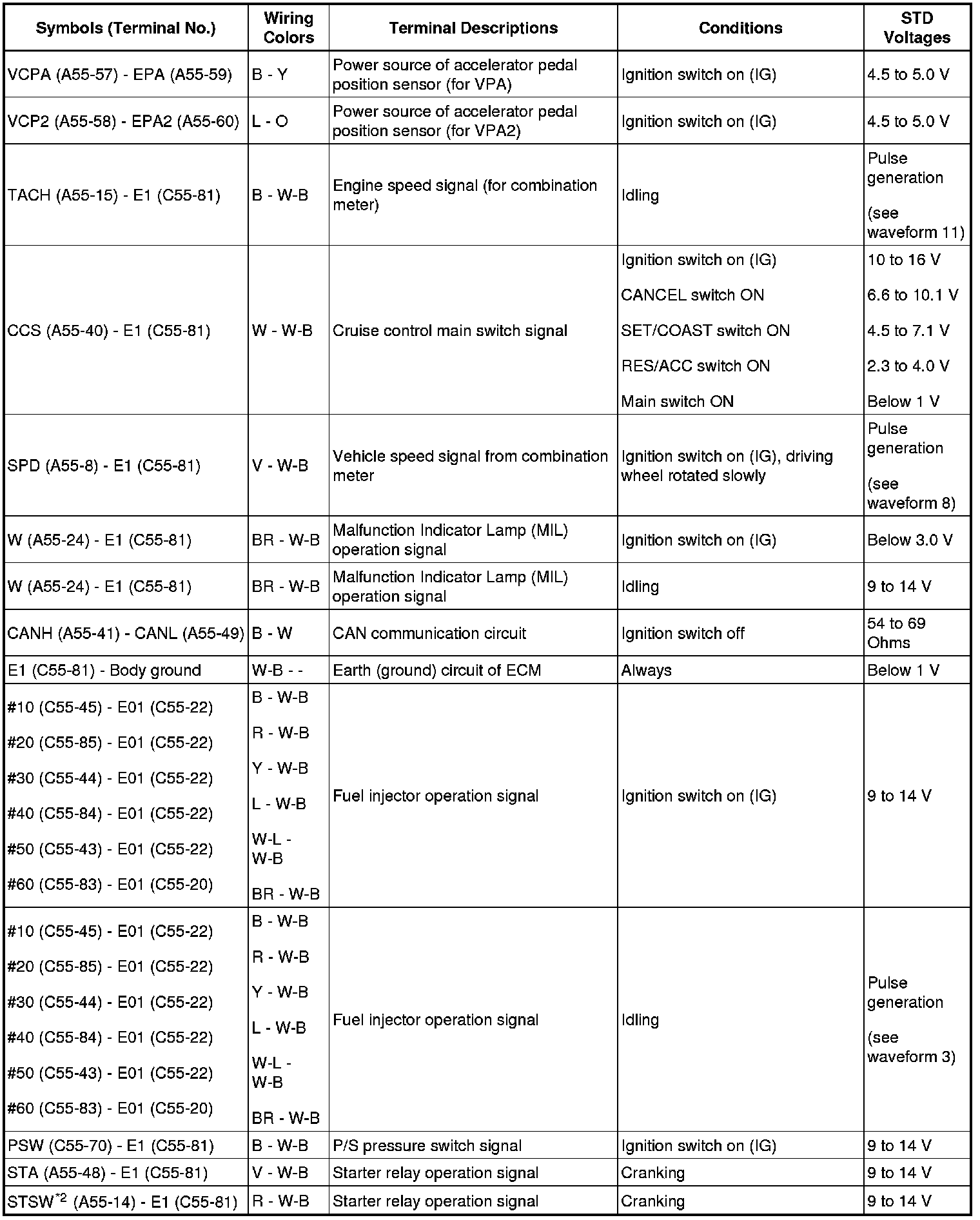 HINT: The standard normal voltage between each pair of the ECM terminals is shown in the table below. The appropriate conditions for checking each pair of the terminals are also indicated.