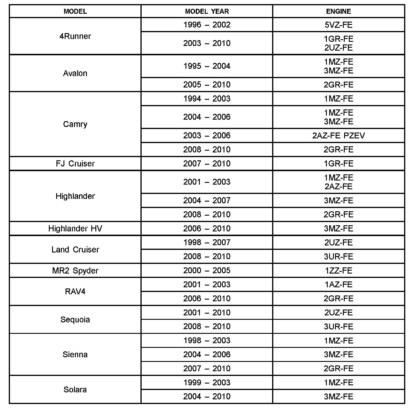 1AZ-FE, 2AZ-FE, 2AZ-FE (PZEV), 1GR-FE, 2GR-FE, 2JZ-GE, 1MZ-FE, 3MZ-FE, 1UR-FE, 3UR-FE, 2UZ-FE 5VZ-FE and 1ZZ-FE.