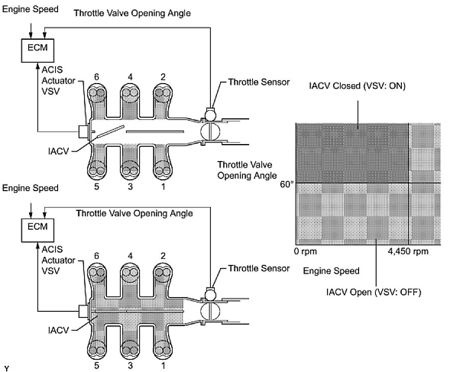 This circuit opens and closes the Intake Air Control Valve (IACV) in response to changes in the engine load in order to increase the intake efficiency (ACIS: Acoustic Control Induction System).