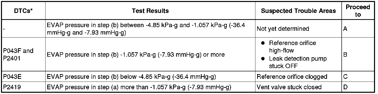 NOTE: If the reference pressure difference between the first and second checks is greater than the specification, all the DTCs relating to the reference pressure (P043E, P043F, P2401, P2402 and P2419) are stored.