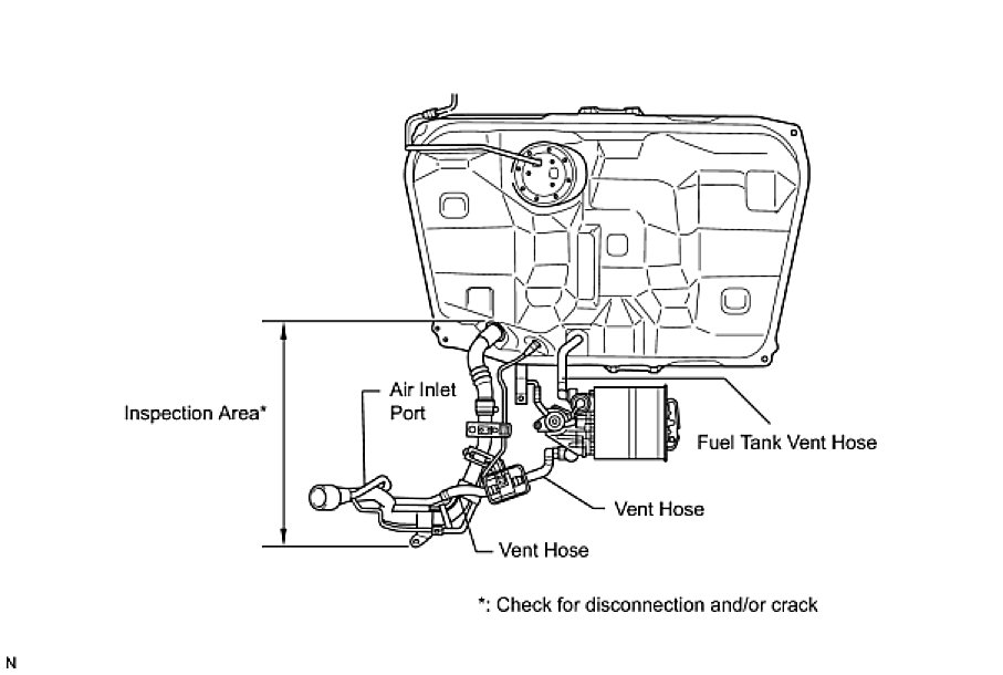 NOTE: In this vehicle's EVAP system, turning ON the vent valve does not seal off the EVAP system. To check for leaks in the EVAP system, disconnect the air inlet vent hose and apply pressure from the atmospheric side of the canister.
