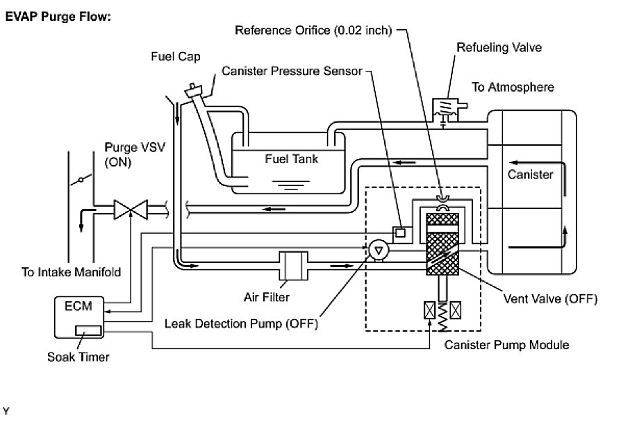 The purge flow volume is also determined by the intake manifold pressure. Atmospheric pressure is allowed into the canister through the vent valve to ensure that the purge flow is maintained when negative pressure (vacuum) is applied to the canister.