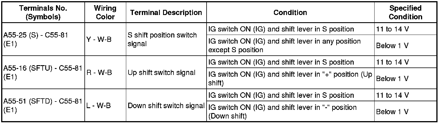 In the table, first follow the information under "Condition". Look under "Terminals No. (Symbols)" for the terminals to be inspected. The standard voltage between the terminals is shown under "Specified Condition".