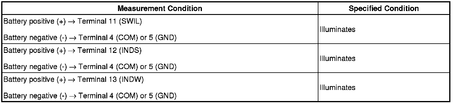 (b) Apply battery voltage between the terminals of the switch, and check the illumination condition of the switch.