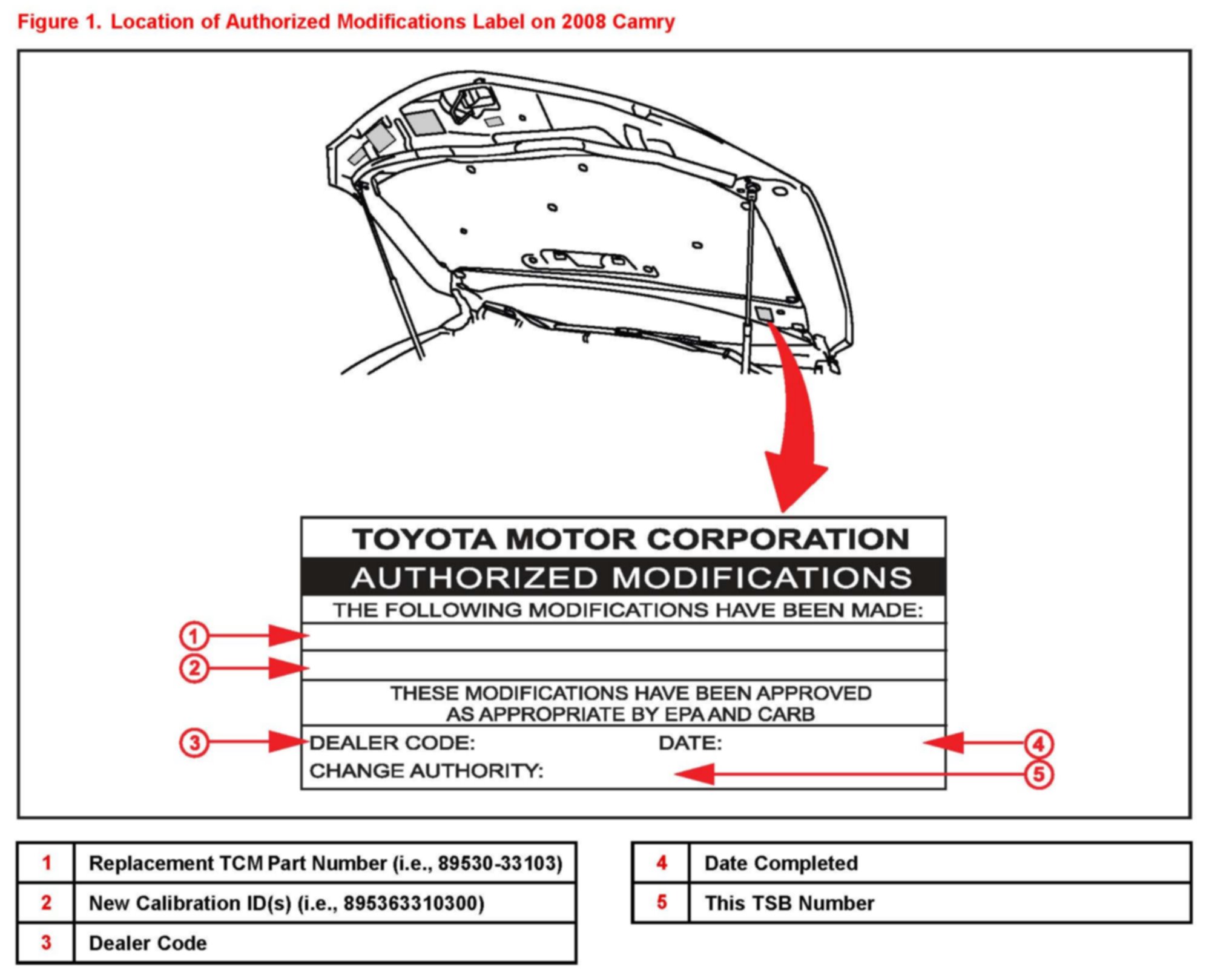 1. Check for the Authorized Modifications Label affixed to the vehicle in the location shown in Figure 1. Confirm if the TCM calibration has been updated. If the calibration ID listed is NOT the latest TCM calibration - go to step 2.