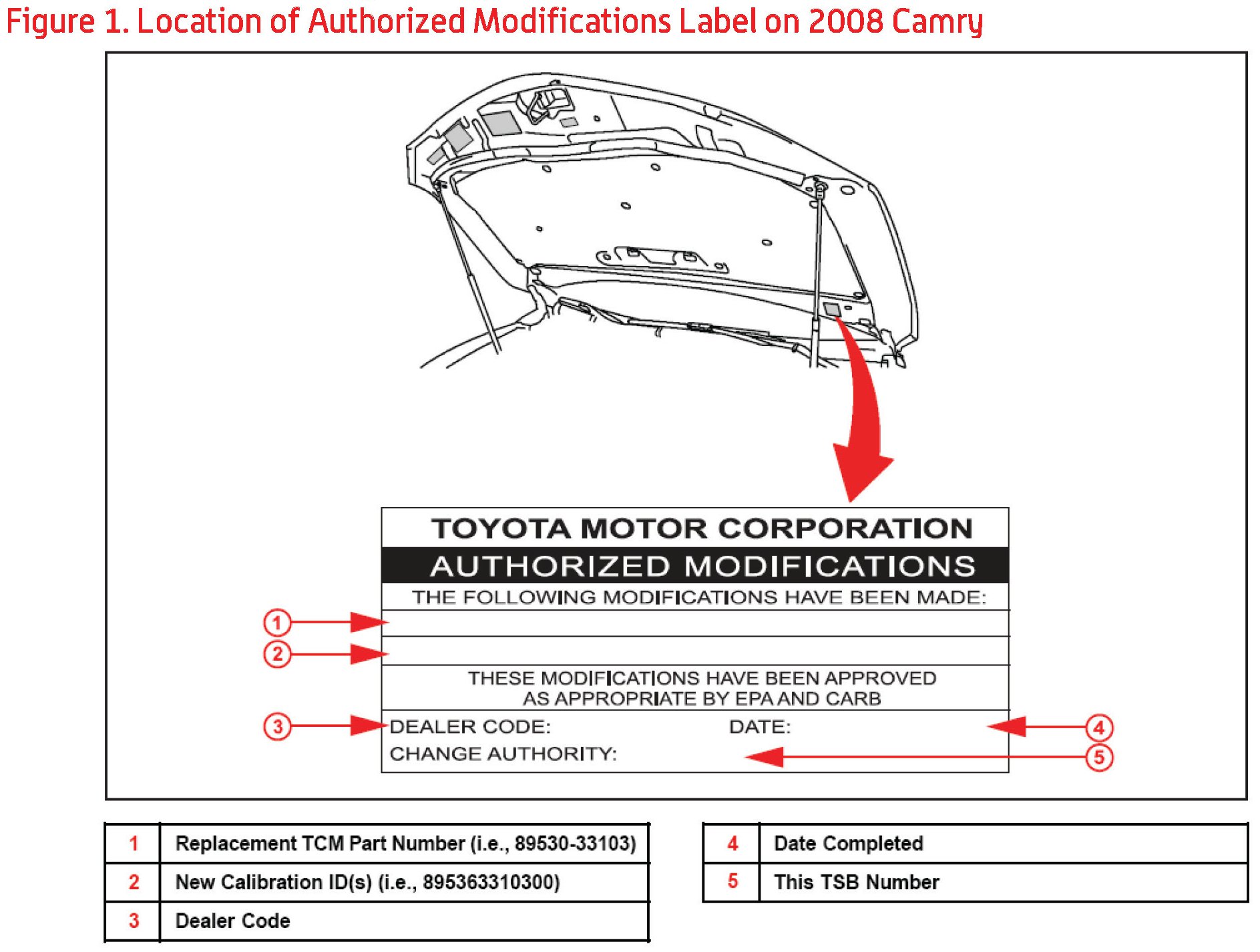 1. Check for the Authorized Modifications Label affixed to the vehicle in the location shown in Figure 1. Confirm if the TCM calibration has been updated. If the calibration ID listed is NOT the latest TCM calibration - go to step 2.