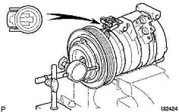 (b) Connect the battery positive lead to the magnetic clutch connector and the negative lead to the earth wire. Turn on and off the magnetic clutch and measure the clearance.