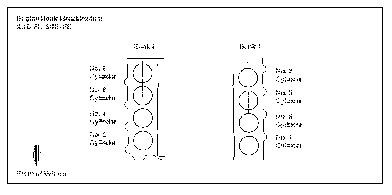 This bulletin contains information that identifies engine bank 1 and engine bank 2 on the following engines: 1AZ-FE, 2AZ-FE, 2AZ-FE (PZEV), 1GR-FE, 2GR-FE, 2GR-FSE, 2JZ-GE, 1MZ-FE, 3MZ-FE, 1UR-FSE, 3UR-FE, 2UZ-FE, 3UZ-FE, 5VZ-FE, and 1ZZ-FE.