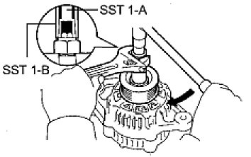 (d) To loosen the pulley nut, turn SST 1-A in the direction shown in the illustration.