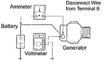 (1) Disconnect the wire from terminal B of the generator and connect it to the negative (-) lead of an ammeter.