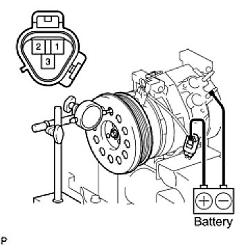 (c) Connect the battery positive lead to terminal 3 (MG+) of the magnet clutch connector and the negative lead to the earth wire. Turn the magnet clutch on and off and measure the clearance.