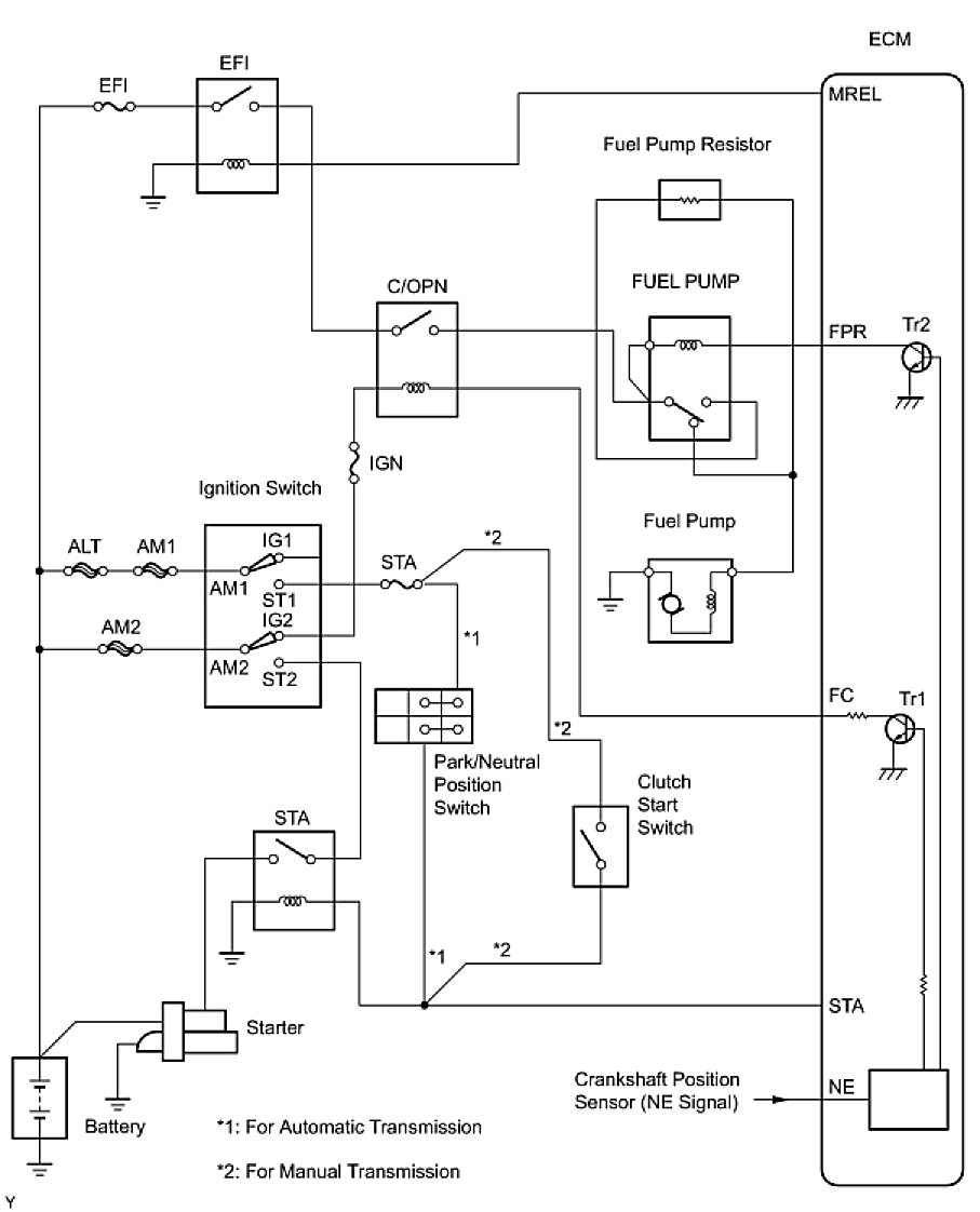 When the STA signal and NE signal are input to the ECM, Tr1 (power transistor 1) is turned ON, current flows to the coil of the circuit opening relay, the relay switches on, power is supplied to the fuel pump, and the fuel pump operates.