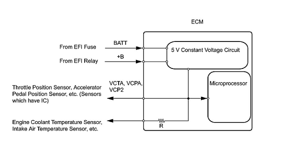 The ECM constantly generates 5 V power from the battery voltage supplied to the +B (BATT) terminal to operate the microprocessor. The ECM also provides this power to the sensors through the VC output circuit.