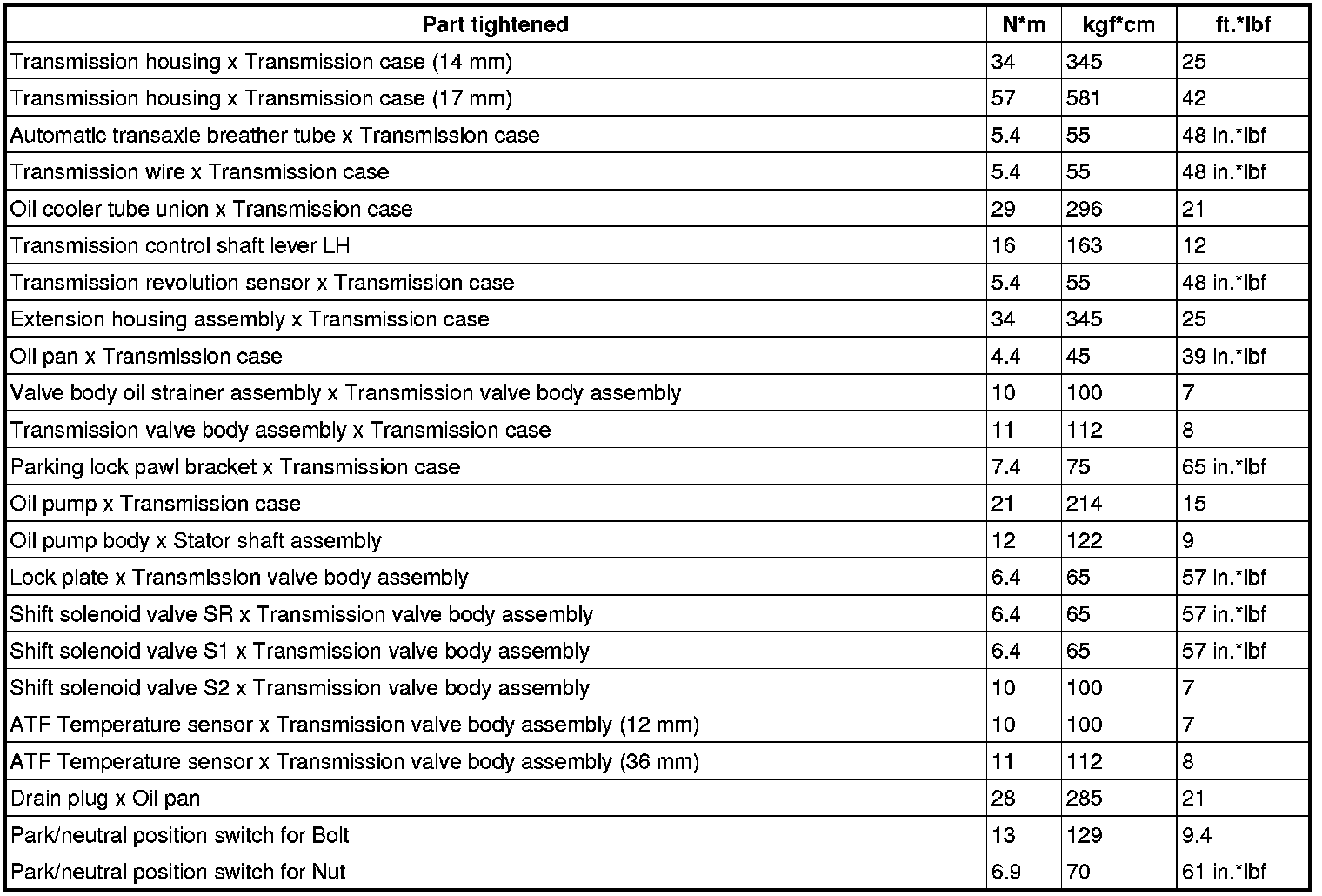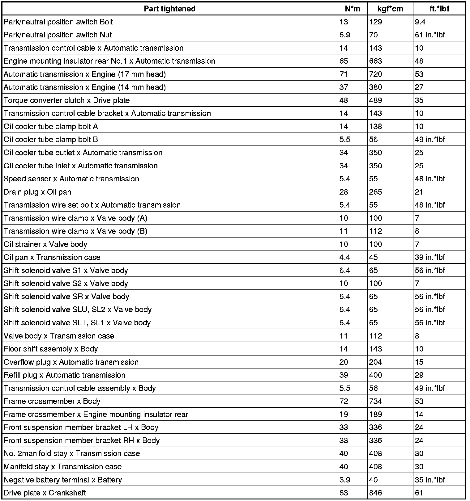 SERVICE SPECIFICATIONS: A750E AUTOMATIC TRANSMISSION: TORQUE SPECIFICATIONS