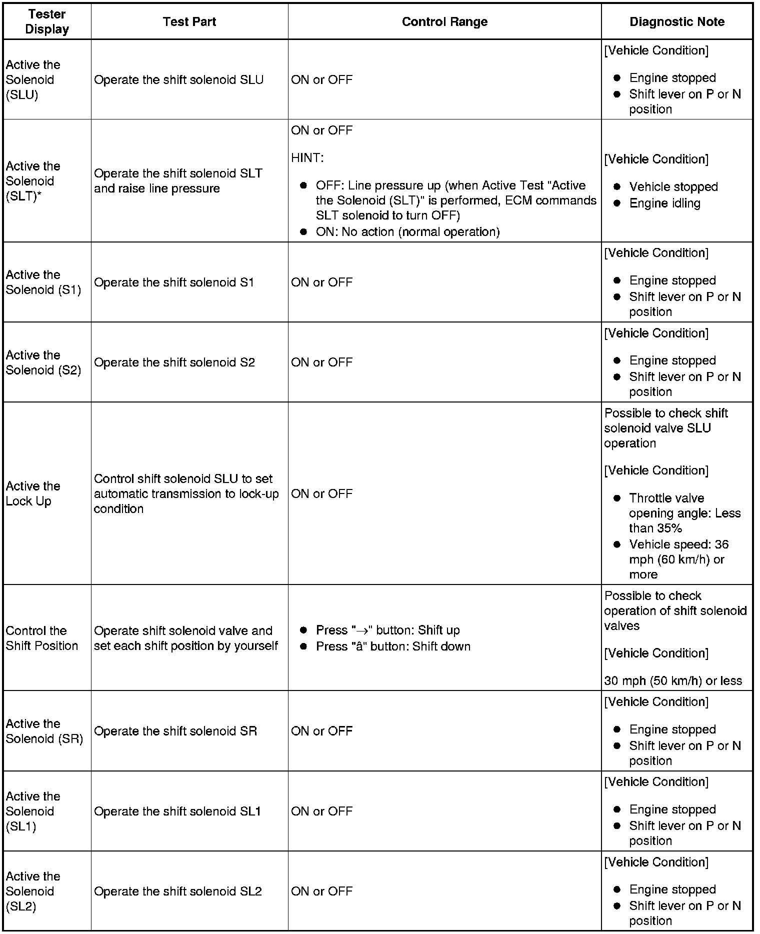 *: Active the Solenoid (SLT) in the Active Test is performed to check the line pressure changes by connecting SST to the automatic transmission, which is used in the HYDRAULIC TEST Hydraulic Test as well. Please note that the pressure values in the Active Test and HYDRAULIC TEST are different.