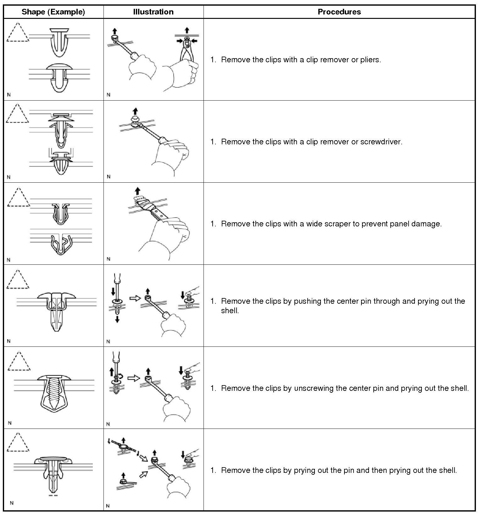 (1) The removal and installation methods of typical clips used for vehicle body parts are shown in the table below.