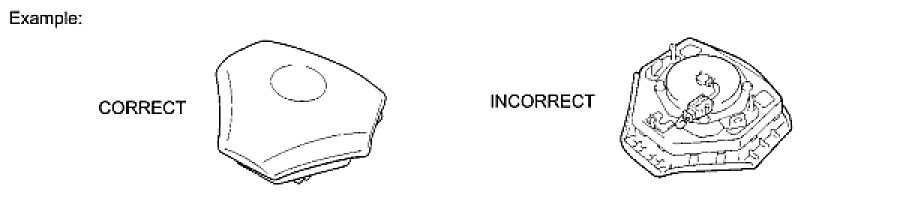 (1) Always place a removed or new steering pad surface upward as shown in the illustration. Placing the horn button with the pad surface facing down could cause a serious accident if the airbag inflates. Also, do not place anything on top of the horn button.