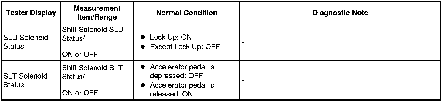 *: Active the Solenoid (SLT) in the Active Test is performed to check the line pressure changes by connecting SST to the automatic transmission, which is used in the HYDRAULIC TEST Hydraulic Test as well. Please note that the pressure values in the Active Test and HYDRAULIC TEST are different.