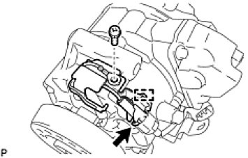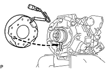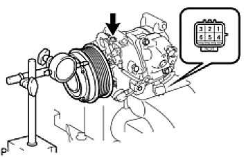 (a) Install the magnetic clutch stator while aligning the protrusion on the stator with the notch on the air compressor assembly as shown in the illustration.