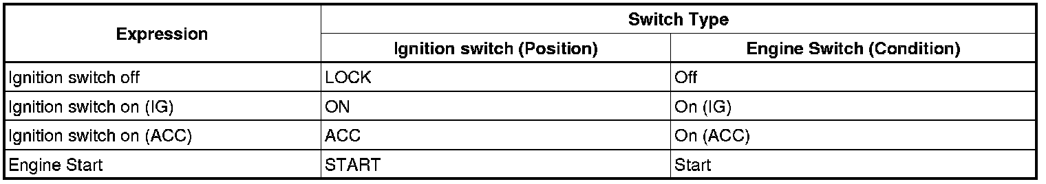 The type of ignition switch used on this model differs according to the specifications of the vehicle. The expressions listed in the table below are used in this section.