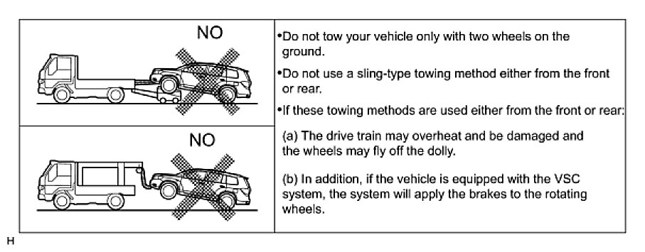(c) The following towing methods shown are dangerous and can damage the vehicle, so do not use them.