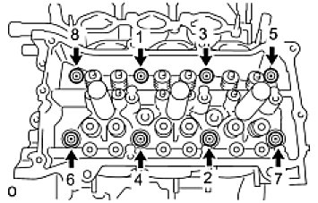 CYLINDER HEAD SUB-ASSEMBLY RHUsing a 10 mm bi-hexagon wrench, install and uniformly tighten the 8 cylinder head bolts with the plate washers in several steps and in the sequence shown in the illustration.
