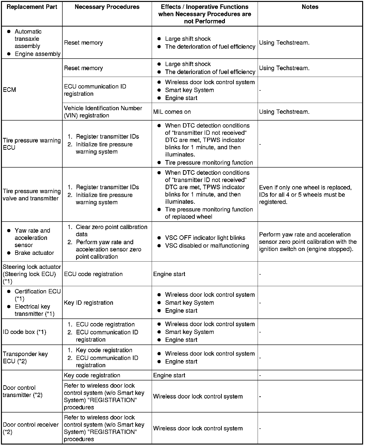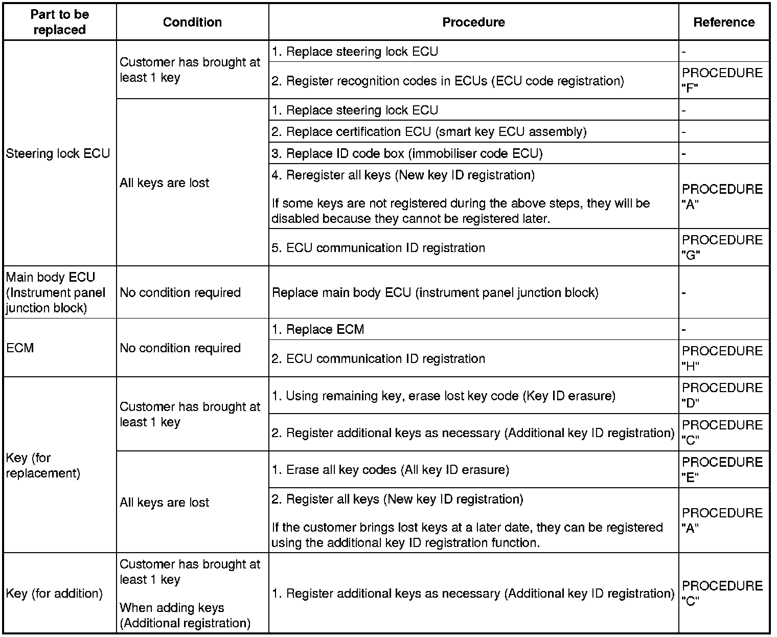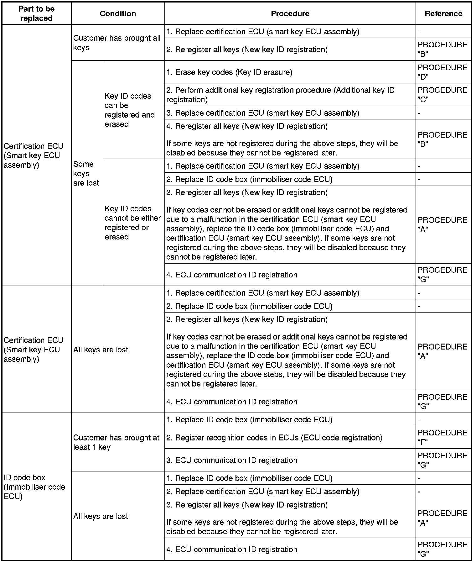 (a) The following table shows ECU replacement and key registration procedures for cases in which a malfunctioning ECU has been identified through the troubleshooting of the smart key system.