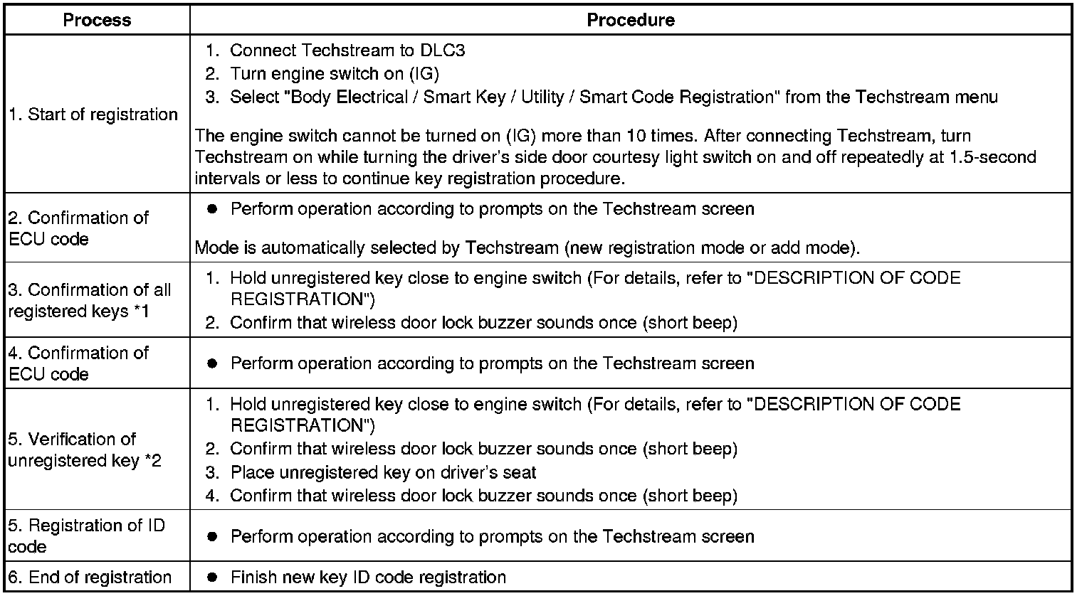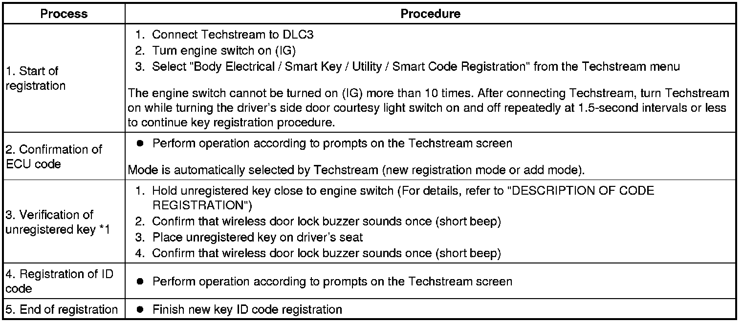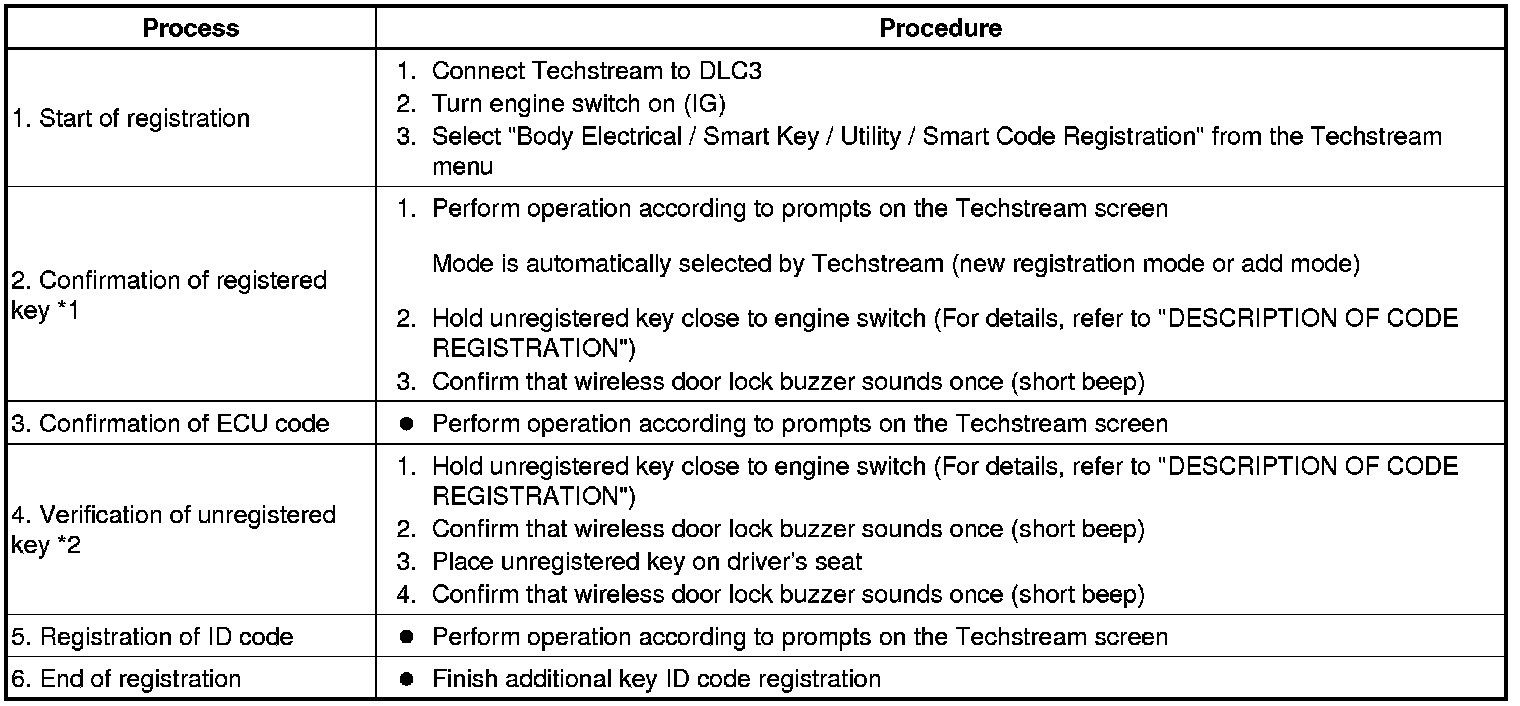 - *1: Perform this process for one of the keys registered for the vehicle. Finish the procedure within 30 seconds. If the procedure has not been finished within the specified time, perform the registration procedures again from process 1.