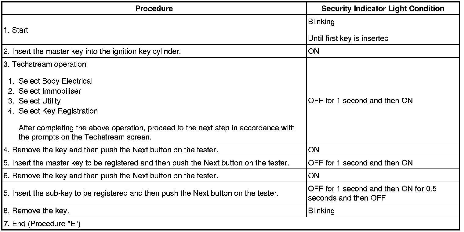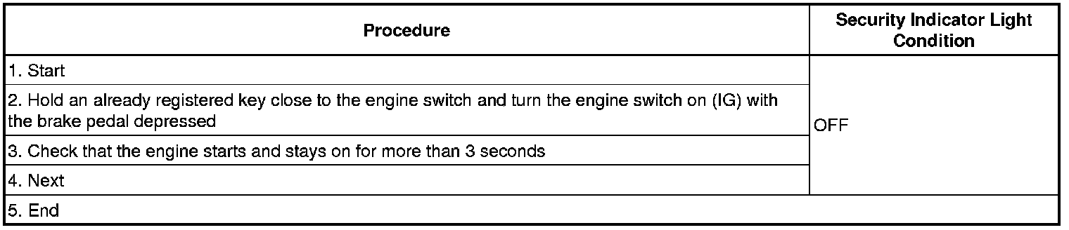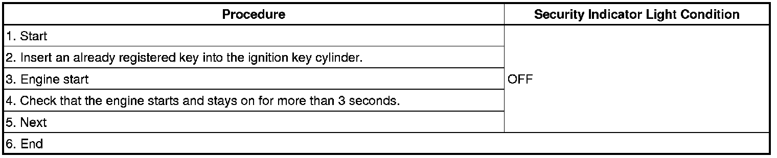 - *1: Repeat this process for each key registered for the vehicle. Finish the procedure for each key within 30 seconds. If the procedure for any of the keys has not been finished within the specified time, perform the registration procedures again from process 1. If the key confirmation procedure for a key is performed, the security indicator light comes on and remains on until all the keys are confirmed.