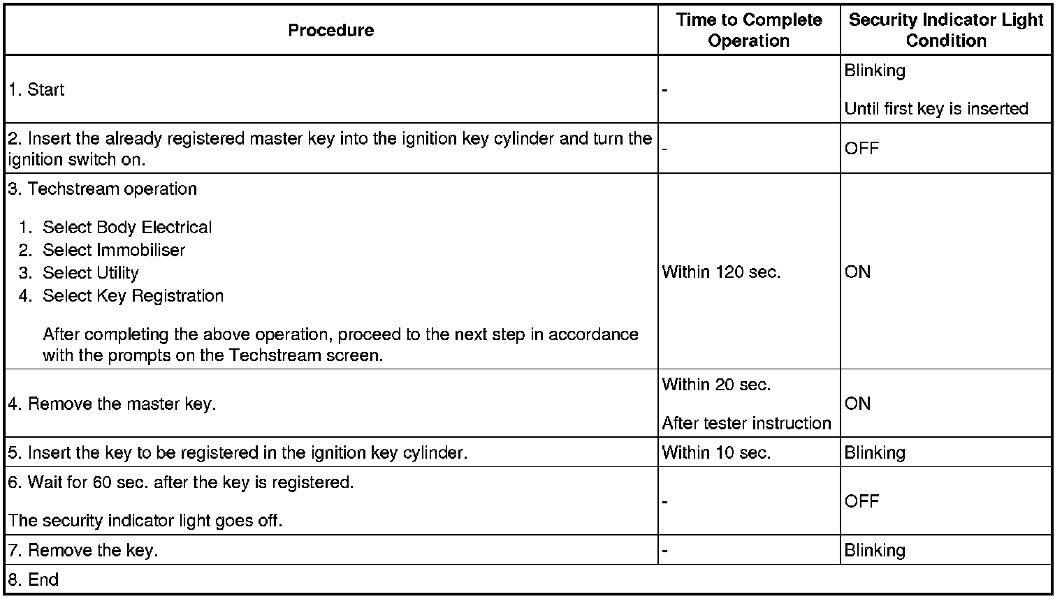 - A brief outline of key code registration procedures is shown above. For detailed information, refer to the Techstream screen.