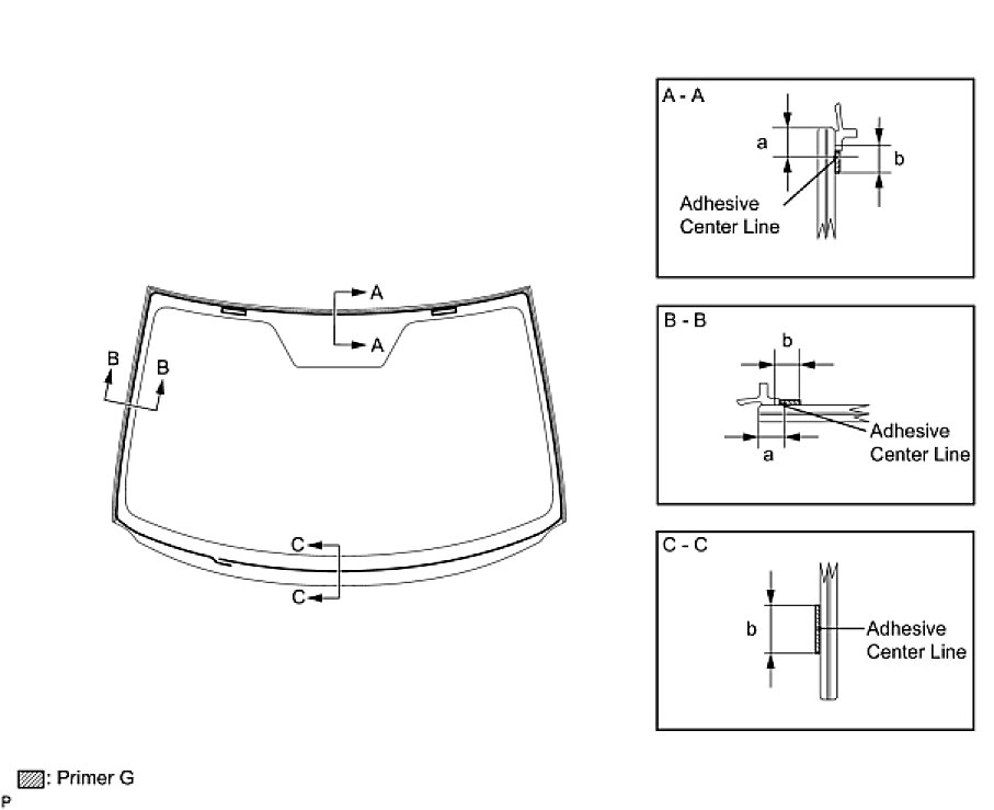 (a) Using a brush or sponge, coat the application area of the No. 2 windshield glass stoppers with Primer G.