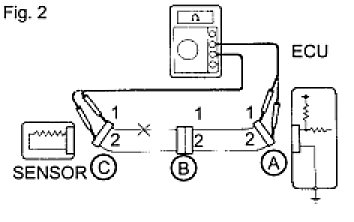 HINT: Measure the resistance while lightly shaking the wire harness vertically and horizontally. If your results match the examples above, an open circuit exists between terminal 1 of connector A and terminal 1 of connector C.