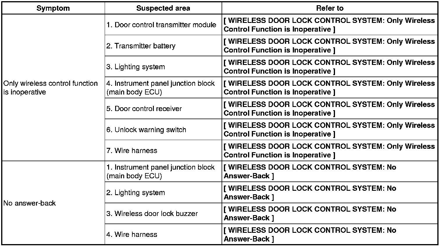 DOOR LOCK: WIRELESS DOOR LOCK CONTROL SYSTEM: PROBLEM SYMPTOMS TABLE