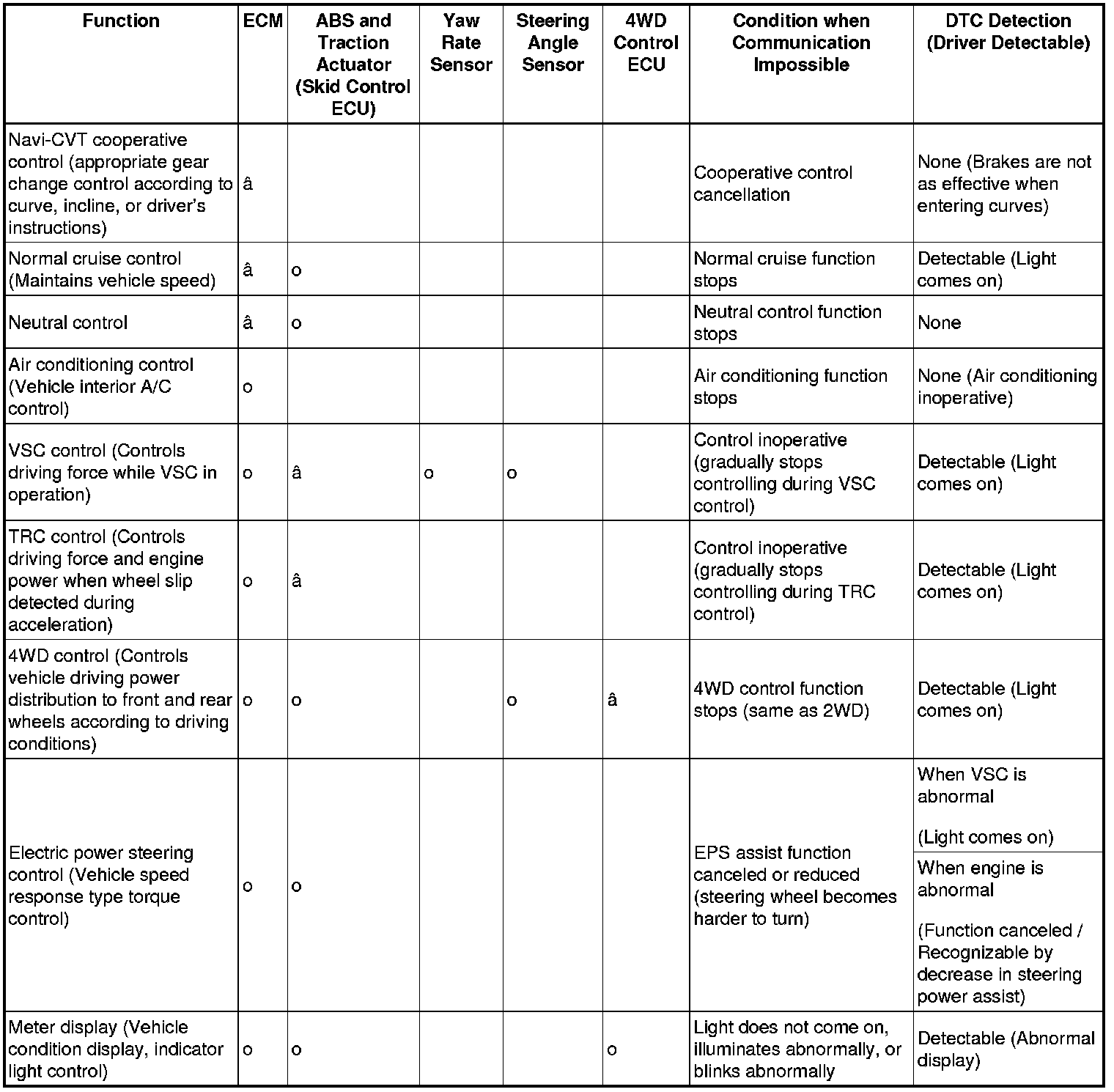 - o: Related ECU or sensor
