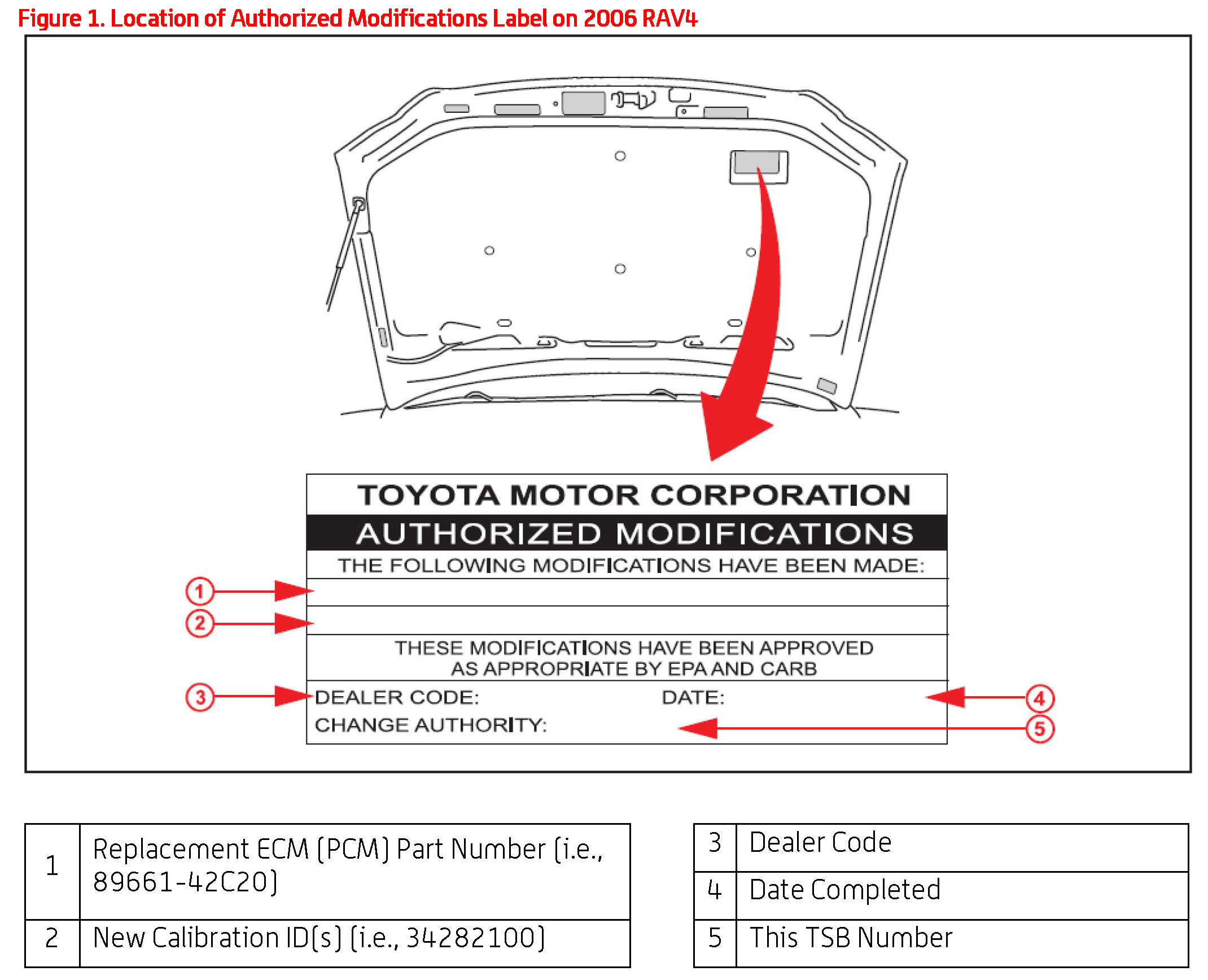 1. Check for the Authorized Modifications Label affixed to the vehicle in the location shown in Figure 1. Confirm if the ECM [PCM] calibration has been updated. If the calibration ID listed is NOT the latest ECM [PCM] calibration - go to step 2.