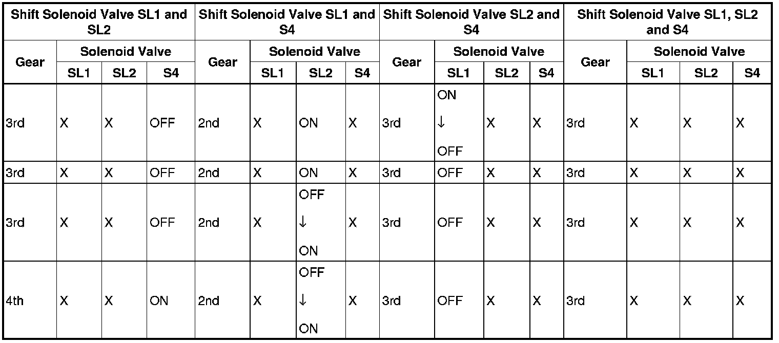 If any of the shift solenoid valve circuits develops an open or short, the ECM turns the other shift solenoid "ON" and "OFF" in order to shift into the gear positions shown in the table below.