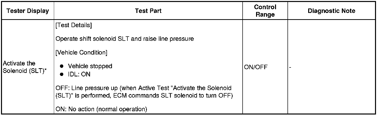 HINT: *: "Activate the Solenoid (SLT)" in the Active Test is performed to check the line pressure changes by connecting SST to the automatic transaxle, which is used in the HYDRAULIC TEST Hydraulic Test as well. Please note that the pressure values in the Active Test and HYDRAULIC TEST are different.